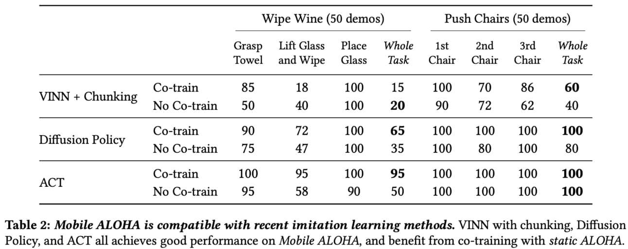 From the table above, let’s focus on Diffusion Policy (DP) and ACT since they performed the best. For Wipe Wine, co-training boosted success 35% → 65% and 50% → 95% for DP and ACT respectively. For Push Chairs, co-training boosted success 80% → 100% for DP (already worked everytime using ACT).